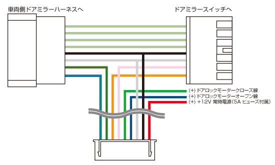 ※付属のワンタッチコネクタを使用すると簡単です。 - 付属ハーネスを、オートドアミラーシステム(本製品本体)に接続します。